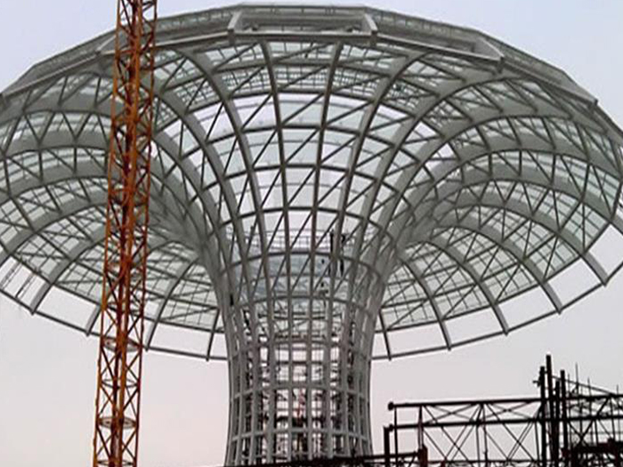 二、球形网架结构因其结构新颖,受力合理,自重轻、用钢量低等优点。如大型体育场馆球形嘉兴螺栓球网架、公共场馆球形网架、电厂嘉兴螺栓球网架、水泥工业球形网架、仓储物流球形网架、嘉兴干煤棚工业球形网架、嘉兴收费站嘉兴加油站球形网架、展览中心、影剧院、商场、航站楼、候车厅、工厂嘉兴车间、仓库、电视塔等球形螺栓球节点网架。国内球形网架结构主要分为:嘉兴焊接球节点网架及螺栓球节点网架两种。螺栓球节点网架其构件工厂内加工量较大,现场安装便捷,适用于现场工期紧,嘉兴施工条件、用电量受制约,网架形状复杂、嘉兴杆件定位困难的异形结构。螺栓球节点球形网架系统基本由嘉兴杆件、螺栓球、支撑支座等组成。按照节点形式可分为交叉嘉兴桁架体系、四角锥体系、三角锥体系等。支撑方式多为固定支座支撑。对于大面积、大跨度及有特殊受力或伸缩要求的网架结构可采用橡胶支座、滑移支座、球铰支座等支撑形式,以满足结构自身的受力稳定、均衡,便于内力释放等设计要求。